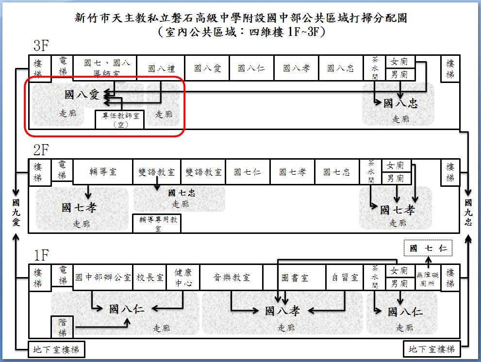 獻堂館一樓平面及資源回收               國八禮班及樓梯前走廊,三樓女廁,國八禮班