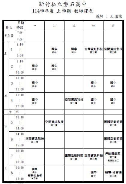 114學年度授課:高中部~~》普三禮:選修地理(上) 空間資訊科技 輔導課:地理》普三義:選修地理(上) 空間資訊科技 輔導課:地理》普二校本課程(風城走讀) 行動博學家》普三義:團體活動時間